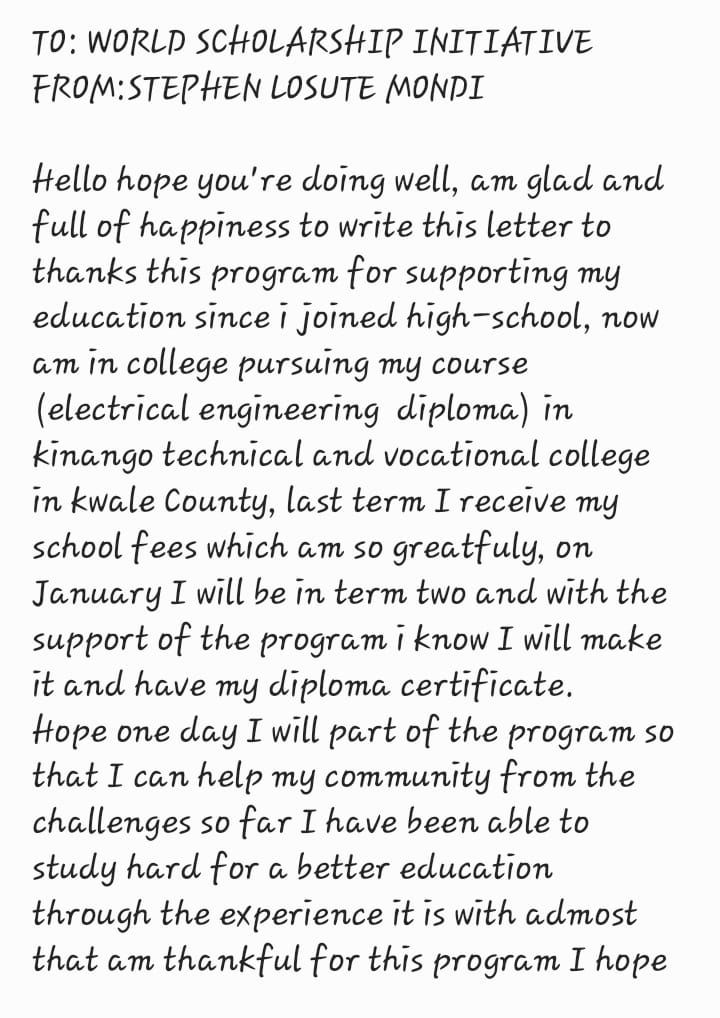 SUBJECT: Heartfelt GratitudeDear esteemed donors,I hope this message finds you well. My name is Damaris Mutuku, a proud beneficiary of your generous support through World Scholarship Initiative. I am currently a second-year law student at Maseno University Kisumu campus, and I would like to express my deepest gratitude for the incredible role you have played in my education journey.Coming from a humble background where pursuing higher education would have been difficult without external support, your assistance has lifted a huge burden off my shoulders. Because of your kindness, I am able to focus fully on my studies without constant worry about financial constraints. Your contribution has provided me with not only access to education but also the confidence to dream bigger. I’m very passionate about becoming a lawyer who will advocate for justice and fairness, especially for vulnerable communities, and each day in class brings me closer to that dream. Although law was initially my second option, I have grown to develop a strong interest in it. I believe it is God’s plan for me, and even though law is a tough course, I am determined to give it my best and remain committed to succeeding.I want you to know that your generosity has truly made a difference in my life. It is more than financial support as it is source of hope and inspiration. Knowing that people in may never have met personally believe in me pushes me to work harder and to give one day back to the society in the same way.From the bottom of my heart, thank you one again of your support. May you continue to be richly blessed for all the lives you touch and transform.Attached are a few photos of myself and my school, to share a glimpse of where your kindness is making such a huge impact.With warm regards,Mutuku Damaris Taabu