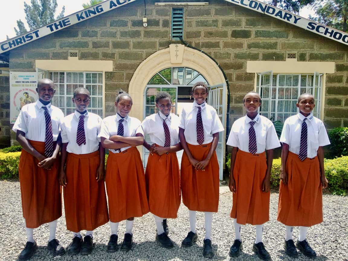 From left to right, the girls are Belinda, Blessing, Jackline, Macrine, Sheila, Abigail and Salome. They shine in their new school uniforms, the mark of a high school student everywhere in Kenya.